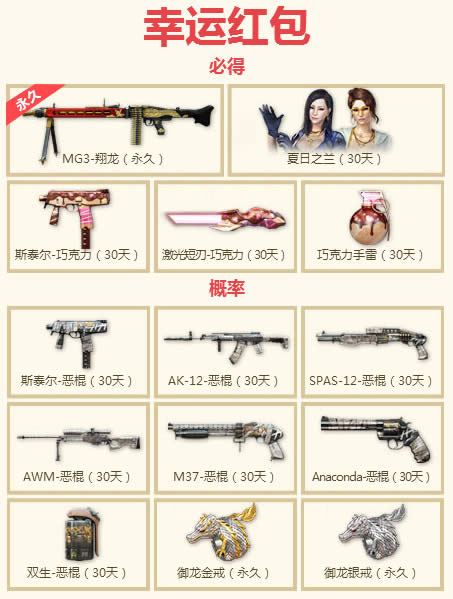 活动期间,每日加入游戏一局,即可任意翻开1个红包,每个红包都会爆出不同品类的宝贝。