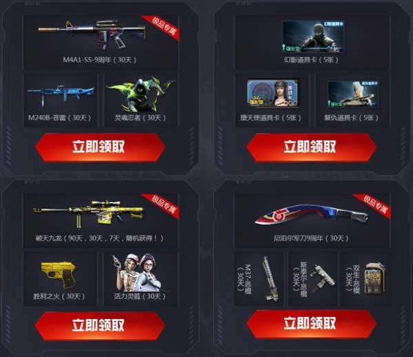 每天游戏一局,即可任意选择一个套装进行领取,每个套装仅能领取一次(每人可以领取3个套装)