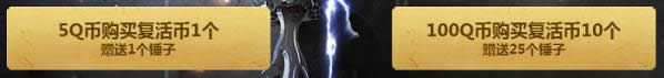 2.5Q币购买复活币1个可获得锤子1个,100Q币购买复活币10个可获得锤子25个;仅限掌上道聚城购买可额外获得1个锤子,单Q限一次;