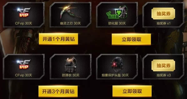 3、开通3个月黄钻可获得CF-VIP30天、 防弹衣30天、烟雾保护头盔30天以及3张抽奖券,单Q每种礼包限参与1次;