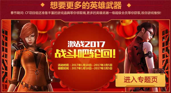 春节期间:CF项目组还准备丰富的游戏道具等你领取哦,更多的英雄武器一级超级会员等你获取,祝你游戏愉快!