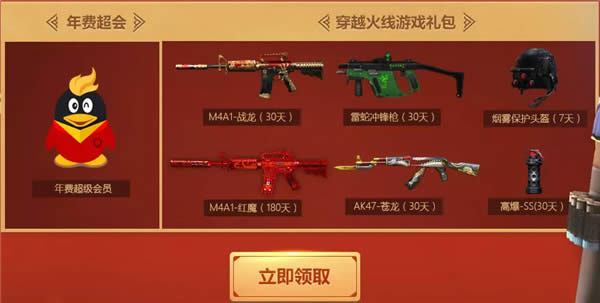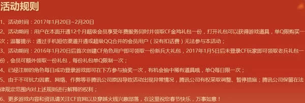 1月1日活动期间:用户在本页面开通12个月超级会员享受年费服务同时并领取CF金鸡礼包一份,打开礼包即可获得游戏道具,单Q限购一次。