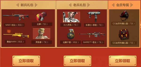 活动期间:2016年1月20日后首次创建CF角色用户即可领取一份新兵大礼包,2017年1月5日后未登录CF玩家即可领取老兵礼包一份,会员可额外领取一份礼包,每份礼包单Q限制一次。