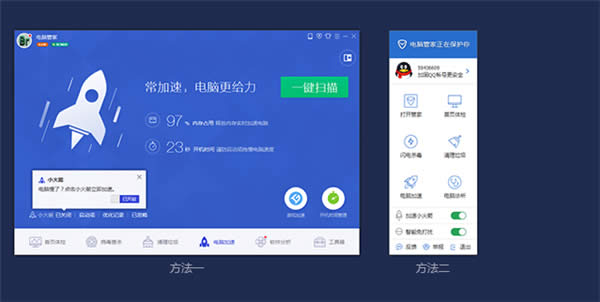 开启方法一:打开管家,在“电脑加速”的左下角打开“小火箭”