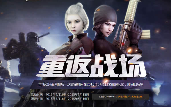 CF2015年4月重返战场活动火热来袭,最后一次登录时间在2015年3月1日之前的玩家若参与本活动将能领取惊喜大礼,下面小编就为你带来活动详情介绍以及活动网址。