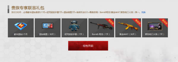 支付15Q币,必得豪华蓝钻贵族1个月+诅咒娃娃手雷7天+蓝钻喷图7天+抽奖机会2次+概率获得(Barrett翔龙黄金AK47紫色枪口火焰)其一。