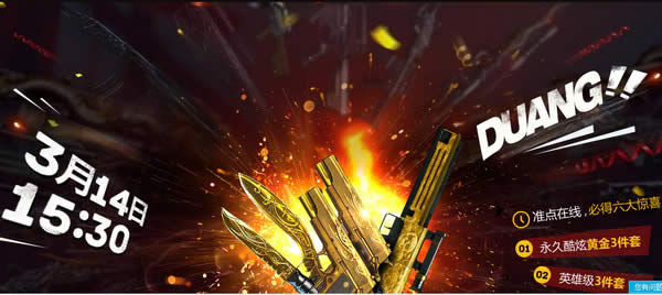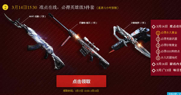 cf3月14日整点在线活动即将正式开始,只要在活动规定的时间在线,就能够获得永久黄金武器,还可以获得全套英雄武器,一起来CF2015年3月14日年度盛典预约活动地址看看吧