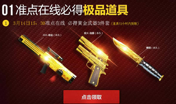 1。3月14日15:30准点在线 必得黄金武器3件套(道具72小时内到账)