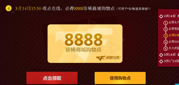 4。3月14日15:30准点在线,必得8888珍稀商城购物点(可用于“珍稀道具商城”)