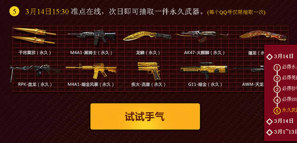5。3月14日15:30准点在线,次日即可抽取一件永久武器。(每个QQ号仅限抽取一次)