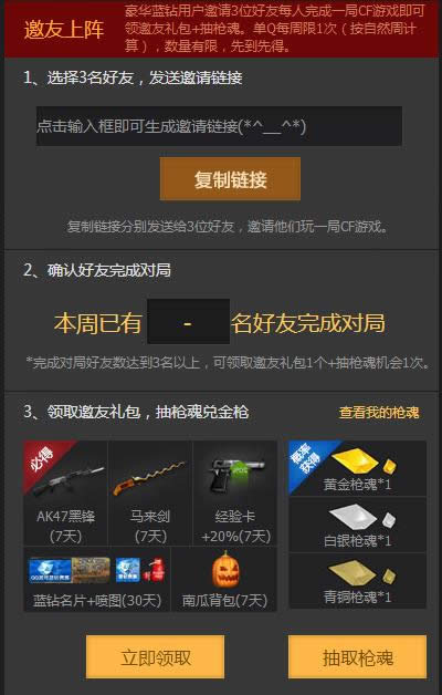 豪华蓝钻用户邀请3位好友每人完成一局CF游戏即可领邀友礼包+抽枪魂。单Q每周限1次(按自然周计算),数量有限,先到先得。