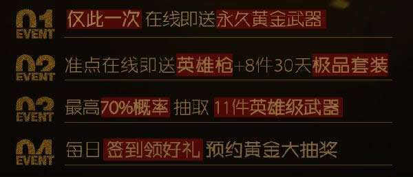 只需要8月9日15:30准时在线,就可以百分百获得永久黄金武器!还有各种英雄抢、极品套装、英雄武器等你来拿。每日签到不仅能领好礼,更能预约黄金大抽奖!