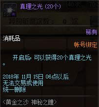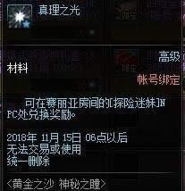 3.活动期间,可以使用【真理之光】在赛丽亚房间内的NPC探险迷妹处兑换奖励。以上道具奖励除【洞悉之眼】为无法交易且无删除日期外,其他道具奖励均为帐号绑定且将于2018年11月15日更新维护后统一删除,请及时使用。账号购买限制将于每周四06点后重置。