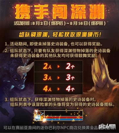 活动期间,勇士们参与深渊派对可以参加活动,在深渊派对上没有获得史诗装备时可获得【深渊鼓舞礼盒】。单人或者组队都能参与活动,单人和组队参与深渊派对情况下,根据不同条件以邮件提供相应奖励。