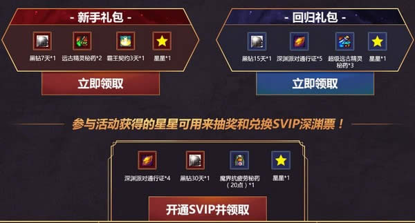 活动期间:每日登录游戏并在线30分钟即可以领取对应礼包1份,单Q每日限领1次,累积在线天数即可领取相应礼包,单Q限领1次,消耗星星可在下方兑换深渊票+SVIP;温馨提示:若出现账号异常的勇士,请前往DNF助手里吐槽反馈里反馈,我们会尽快处理您的问题。