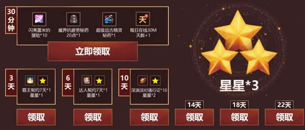 3.活动期间:每日在线30M即可领取在线礼包,同时累积天数+1,玩家累积3天、6天、10天、14天、18天和22天分别可以领取相应的奖励,单Q限1次,游戏奖励请到游戏内查看,消耗星星即可兑换获得更多福利哦。