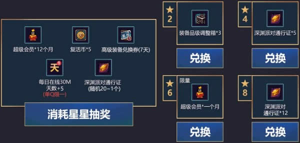 4.通过在线和开通所获得的星星即刻免费抽大奖哦,消耗一定数量的星星分别兑换相应的礼包哦,每份礼包单Q限5次;