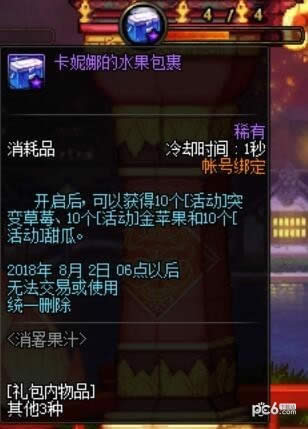 120 分钟 (4/4)卡妮娜的水果包裹 1个开启后, 可以获得10个[活动]突变草莓、 10个[活动]金苹果和10个[活动]甜瓜。