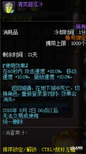 90 分钟 (3/4)[活动]甜瓜礼盒 1个开启后, 可以获得10个[活动]甜瓜。使用后, 增加5%的攻击速度、 施放速度和移动速度。返回城镇、 在地下城中死亡、 切换角色、 重新登录游戏时, 效果会消失。