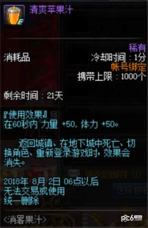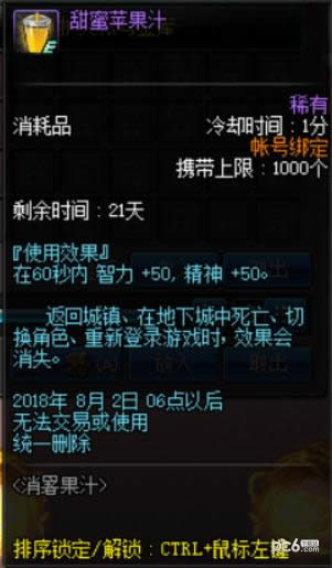 60 分钟 (2/4)[活动]金苹果礼盒 1个开启后, 可以获得10个[活动]金苹果。使用后, 增加20点的力量、 智力、 体力和精神。返回城镇、 在地下城中死亡、 切换角色、 重新登录游戏时, 效果会消失。