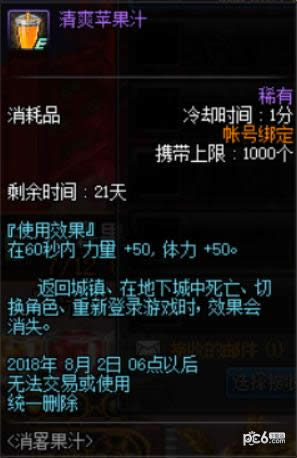 60 分钟 (2/4)[活动]金苹果礼盒 1个开启后, 可以获得10个[活动]金苹果。使用后, 增加20点的力量、 智力、 体力和精神。返回城镇、 在地下城中死亡、 切换角色、 重新登录游戏时, 效果会消失。