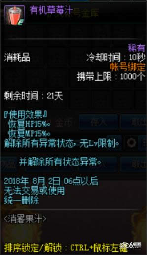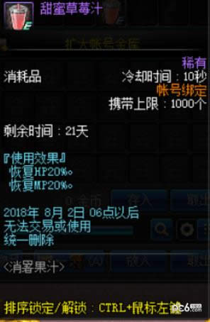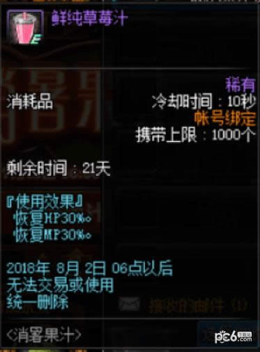 30 分钟 (1/4),[活动]突变草莓礼盒 1个开启后, 可以获得10个[活动]突变草莓。使用后, 恢复10%的HP和MP。 与其他恢复类道具共享冷却时间。