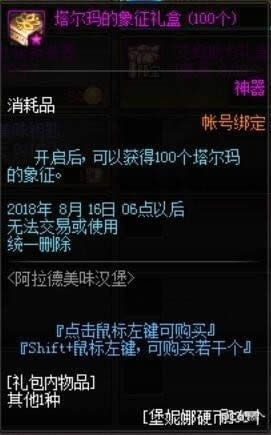 30塔尔玛的象征礼盒 (100个)开启后,可以获得100个塔尔玛的象征。每账号3个