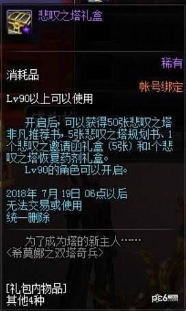 请函礼盒 (5张) 和1个悲叹之塔恢复药剂礼盒。Lv90的角色可以开启。