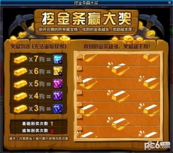 Lv17及以上角色通关2次推荐地下城可以获得1次机会,每日最多获得2次消耗一次机会可以刮开所有可以点击的区域查看挖出的金条数量