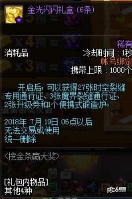 开启后,可以获得400张时空裂缝专用通行证、 10张升级券(Lv50 ~88)、 1张+7 装备锻造券和20个便携式锻造炉。