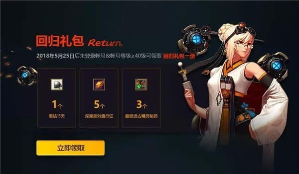 回归礼包:5月25日后未登录账号且等级≥40级可领取回归礼包一份:黑钻15天+深渊派对通行证x5+超级远古精灵秘药x3;