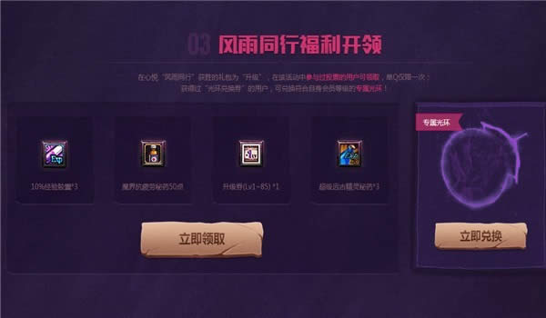 3.在心悦“风雨同行”获胜的礼包为“升级”,在该活动中参与过投票的用户可领取,单Q仅限一次;获得过“光环兑换券”的用户,可兑换符合自身会员等级的专属光环!