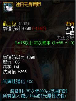 也就是光兵的一绝。当一绝被触发盛开之后会队敌人减少8点光属性抗性。而且这个减抗是有光环范围的。也就是说在魔兽副本的时候疯狂输出怪的同时可以在怪的脚底下放一个一绝来达到减少光抗。你以为这就结束了嘛不不不这才刚刚开始呢。下面我们来看看辅助职业以增加光为核心的一些装备。