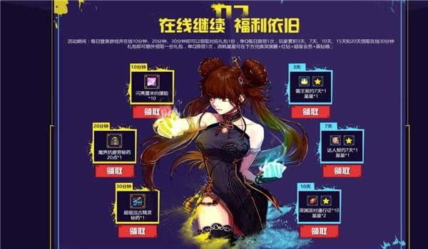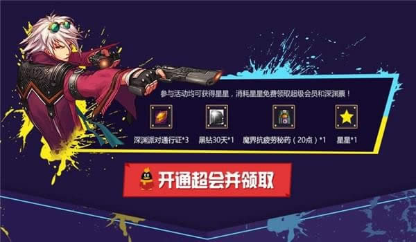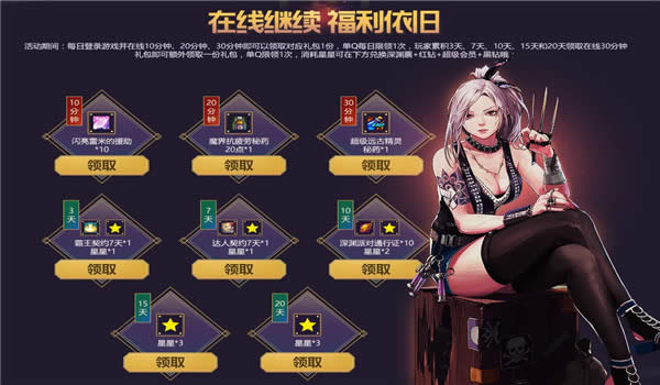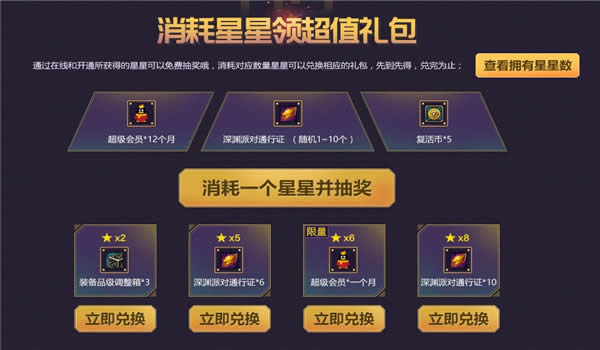活动三在线累积时间获得星星兑换道具抽取深渊票和会员。