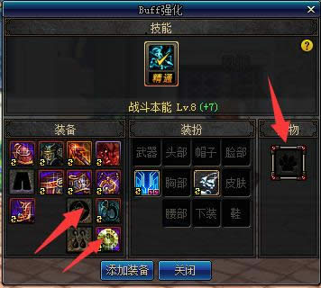 b、各类堆叠技能等级的装备,将战斗本能堆叠到11级。