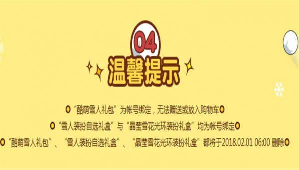 “酷萌雪人礼包”、“雪人装扮自选礼盒”、“晶莹雪花光环装扮礼盒”都将于2018.02.01 06:00 删除