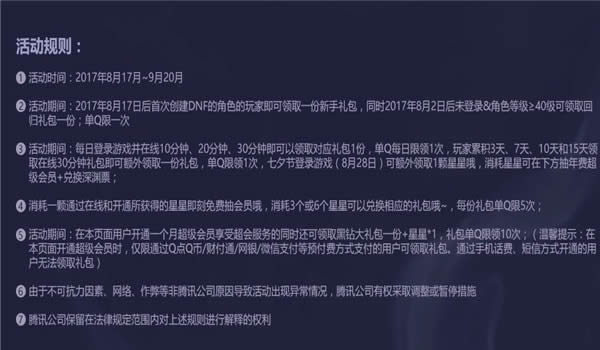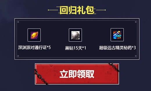 2.活动期间,2017年6月8日以后未登录且40级以上的玩家可以在本活动页领取回归礼包一份,单Q限领1次;
