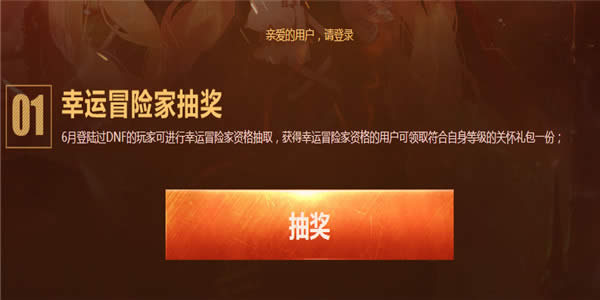 【1】6月登陆过DNF的玩家可进行幸运冒险家资格抽取,获得幸运冒险家资格的用户可领取符合自身等级的关怀礼包一份;