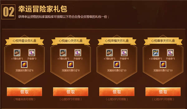 【2】获得幸运资格的玩家冒险家可领取以下符合自身会员等级的礼包一份;