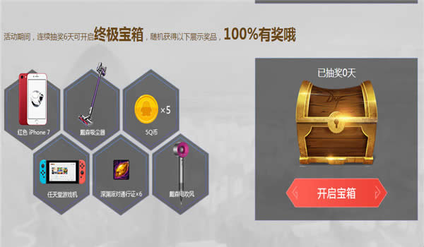 【3】活动期间,每天在线30分钟以上可以开启一次宝箱,可随机获得以下展示礼品,活动期间,连续抽奖6天可开启终极宝箱,随机获得以下展示奖品,100%有奖哦