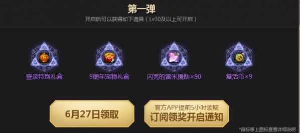 9周年2017年6月24日凌晨6:00至6月25日凌晨6:00登录游戏的用户可以在本页面上领取9周年畅享大礼。