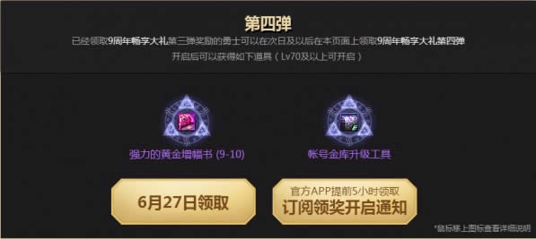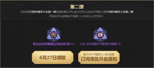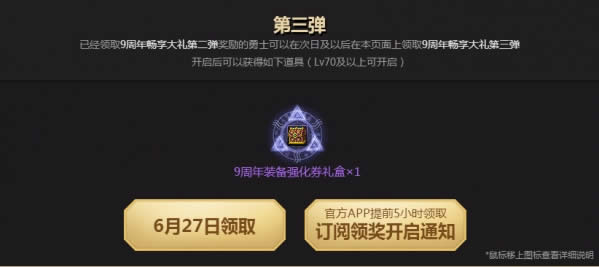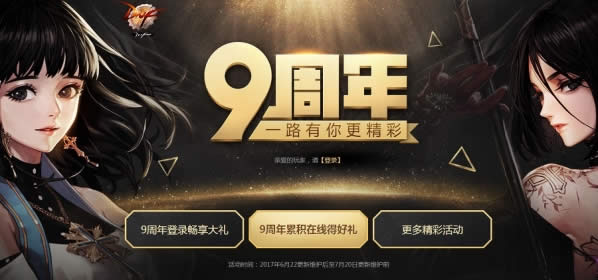 9周年2017年6月24日凌晨6:00至6月25日凌晨6:00登录游戏的用户可以在本页面上领取9周年畅享大礼