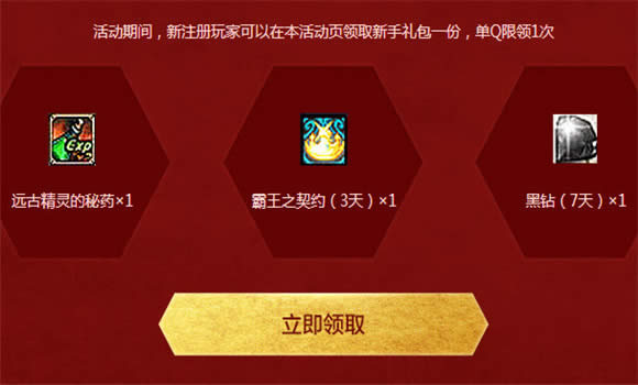 3、活动期间,新注册玩家可以在本活动页领取新手礼包一份,单Q限领1次;