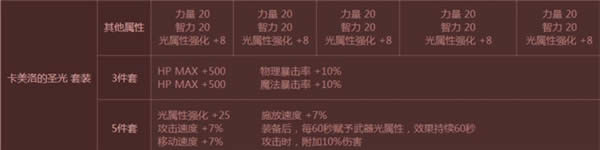 卡美洛套装共分四种,分别是圣光、暗影、烈焰、寒霜,对应着光属性强化、暗属性强化、火属性强化、冰属性强化。