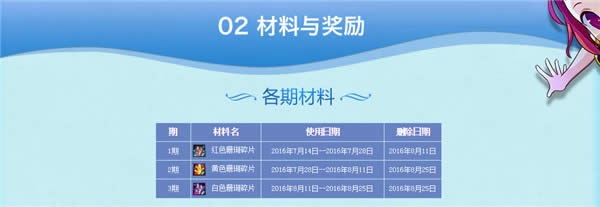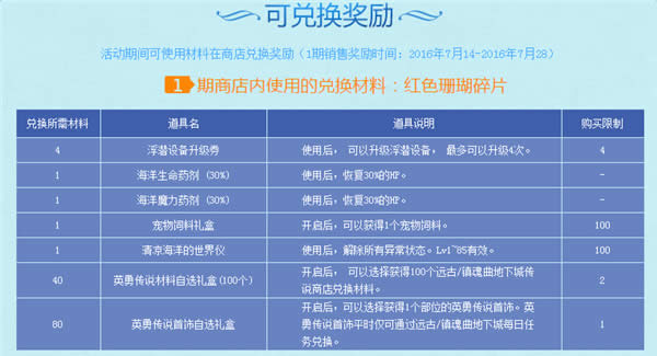 活动期间可使用材料在商店兑换奖励(1期销售奖励时间:2016年7月14-2016年7月28)