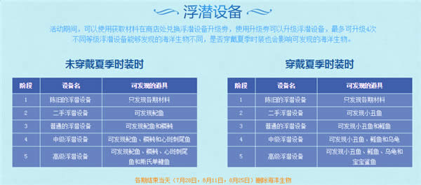 活动期间,可以使用获取材料在商店处兑换浮潜设备升级券,使用升级券可以升级浮潜设备,最多可升级4次