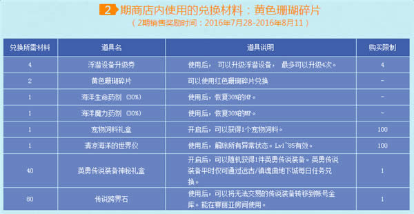 4、以上奖励除了1/2期潜水券、红色珊瑚碎片、传说跨界石(2016年9月8日删除)、各期鱼类外,均于2016年8月25日更新维护后删除,请及时使用;