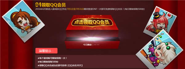 2016年6月新进入游戏的QQ号在7月1日至7月31日期间登录DNF一次即可免费领取QQ会员!(每日限制领取500份)