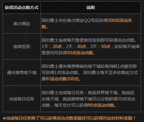 回归勇士可以通过连续签到、组队刷图等方式获得活动点数: