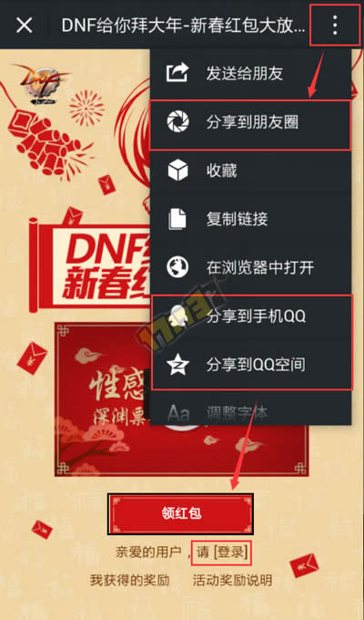 进入活动界面后,登录QQ账号,然后通过右上角的功能,将活动分享至好友圈(分享到手机QQ、分享到QQ空间貌似存在Bug,需要多次分享才能成功领取,所以建议直接分享到朋友圈,无法领取的可再次分享后领取)